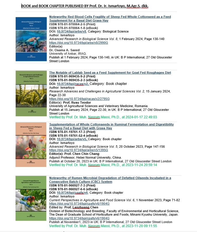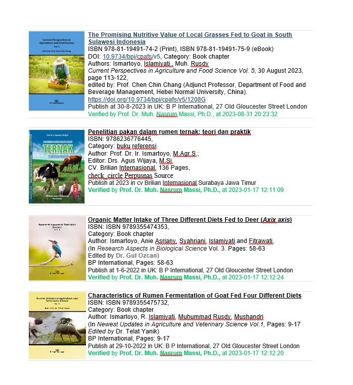 · Ismartoyo, I., Islamiyati, R., & Rusdy, M. (2023, June). Digestibility In Vivo and In Sacco of four local grass resource in South Sulawesi Indonesia. In AIP Conference Proceedings (Vol. 2628, No. 1). AIP Publishing. |