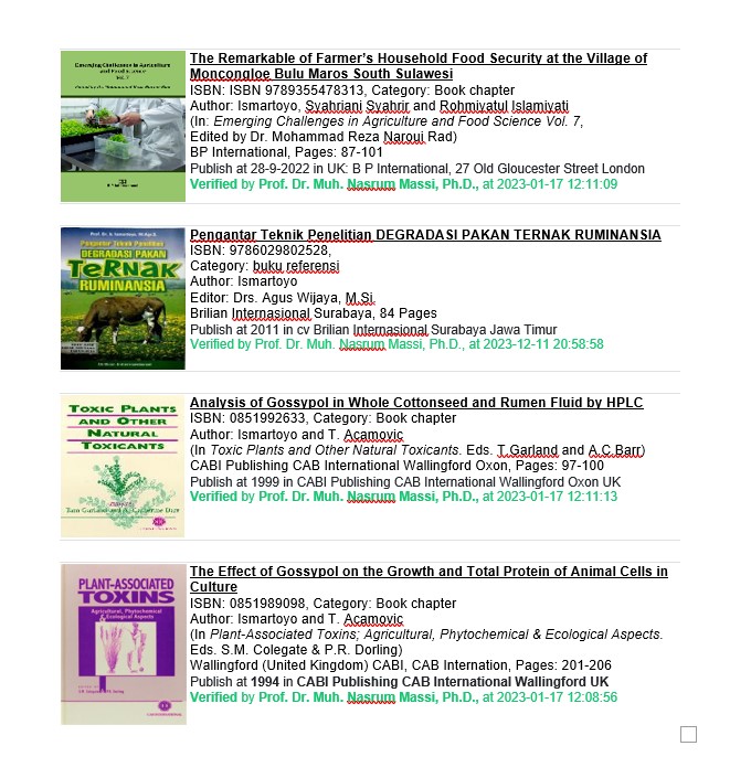 · Atmaja, I. G. M., Ismartoyo, I., Natsir, A., & Syahriani, S. (2023, June). The performance and carcass percentage of goat fed with cocoa POD husk and turmeric. In AIP Conference Proceedings (Vol. 2628, No. 1). AIP Publishing. |