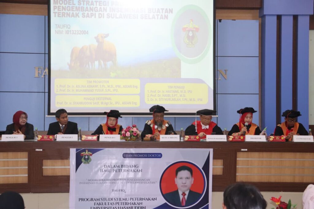 Makassar, 07 April 2026 – Fakultas Peternakan Universitas Hasanuddin (Fapet Unhas) kembali melaksanakan sidang terbuka Promosi Doktor Ilmu Peternakan dengan promovendus Ir. Taufiq, S.Pt., M.Si. yang berhasil mempresentasikan disertasinya yang berjudul “Model Strategi Program Pengembangan Inseminasi Buatan Ternak Sapi di Sulawesi Selatan.”